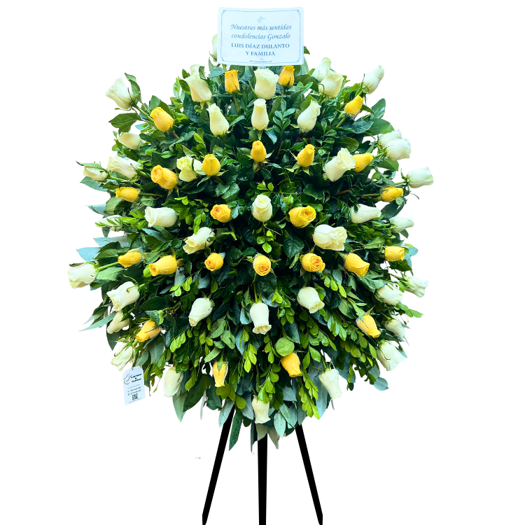 Corona fúnebre grande con rosas amarillas y blancas, full mirto y finos follajes.
